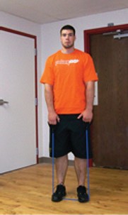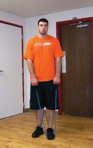 - Stand with your arms extended, with your feet placed shoulder width apart and holding the handles for balance.