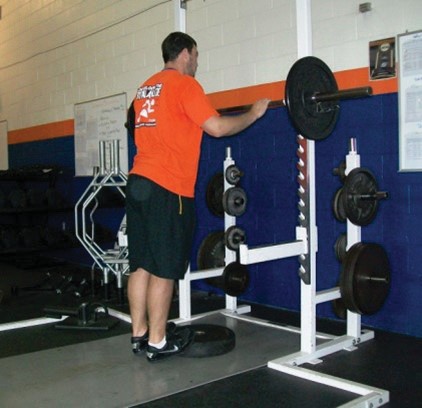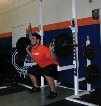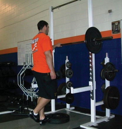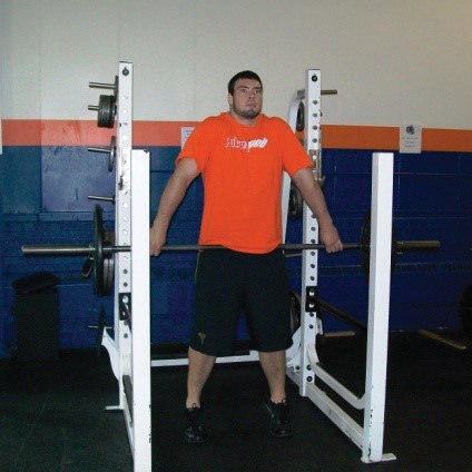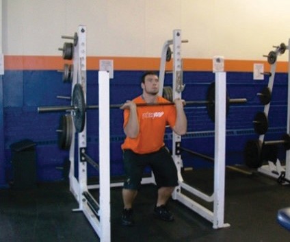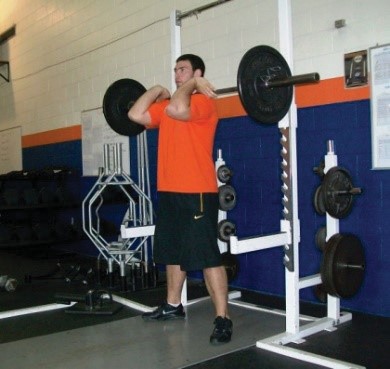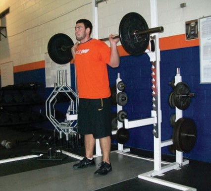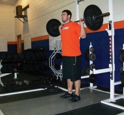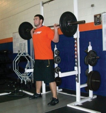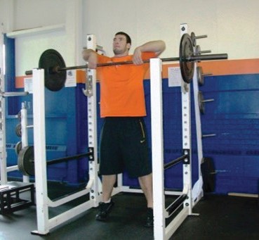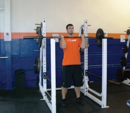 - Squeeze the shoulders back and place the bar high on top of the shoulder muscles