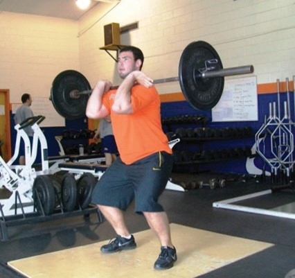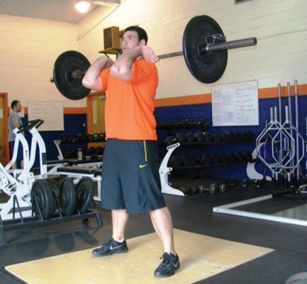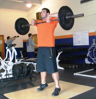 - Squeeze the shoulders back and place the barbell high on top of shoulders