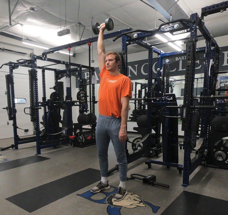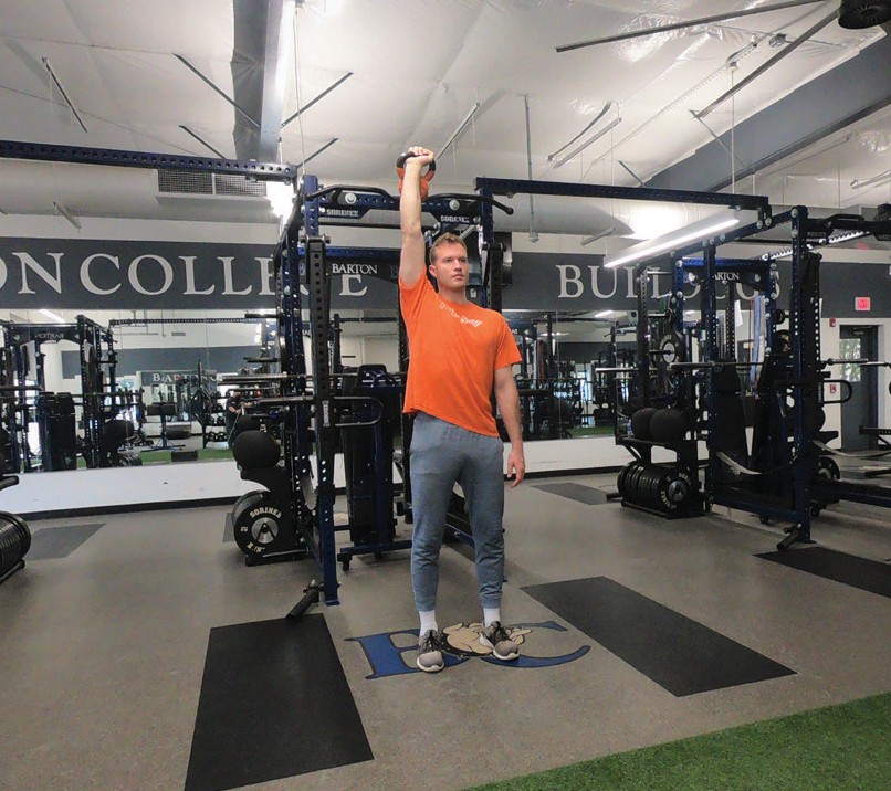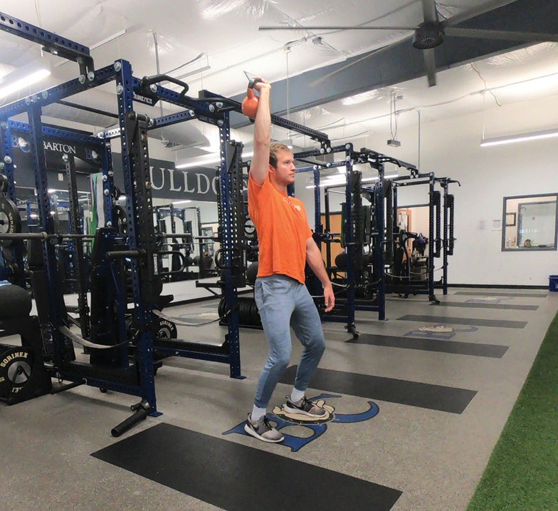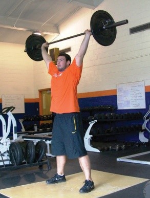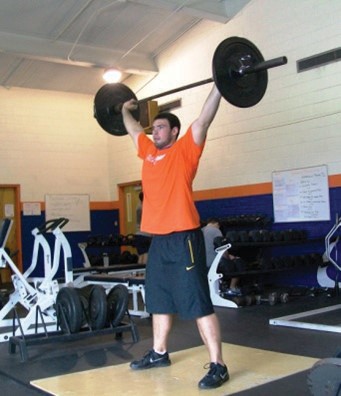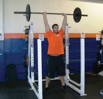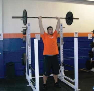 - With a snatch width grip, place the bar overhead slightly behind or directly above the ears
