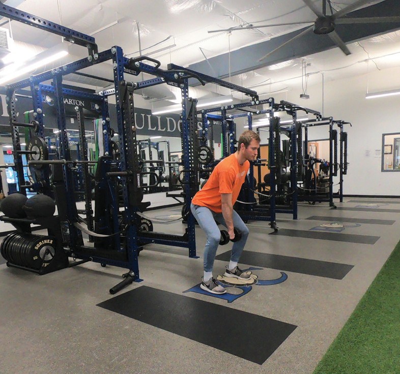 - Keep your chest up, leaning forward slightly, and stick your hips back as you squat to keep your balance and not fall back.
