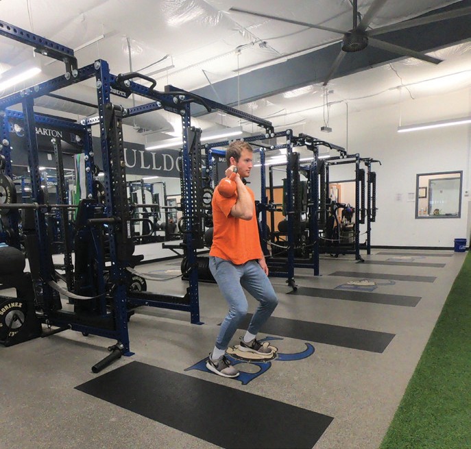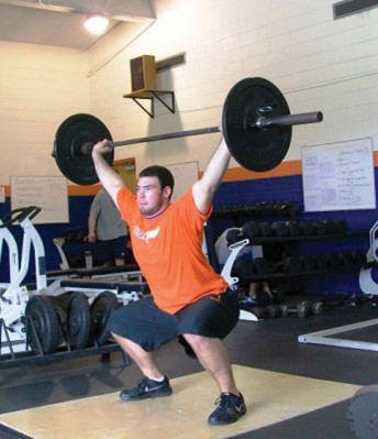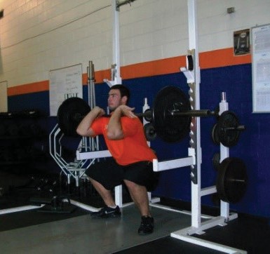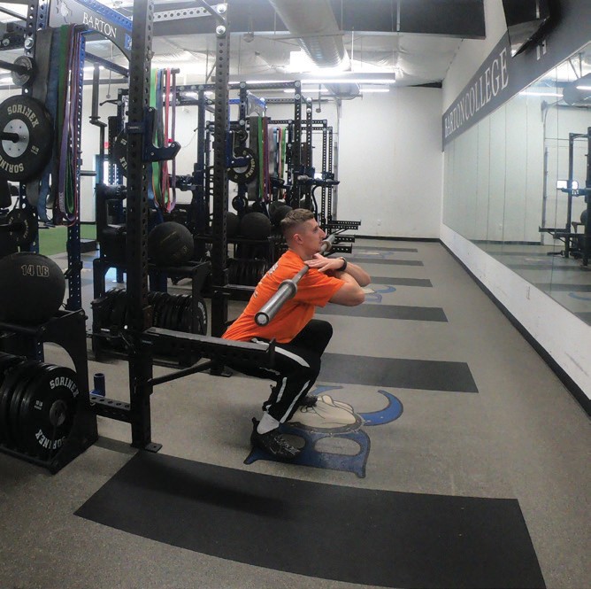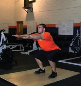 - While performing the lower body squatting movement, focus on keeping the elbows up the entire time and therefore keeping the chest up.