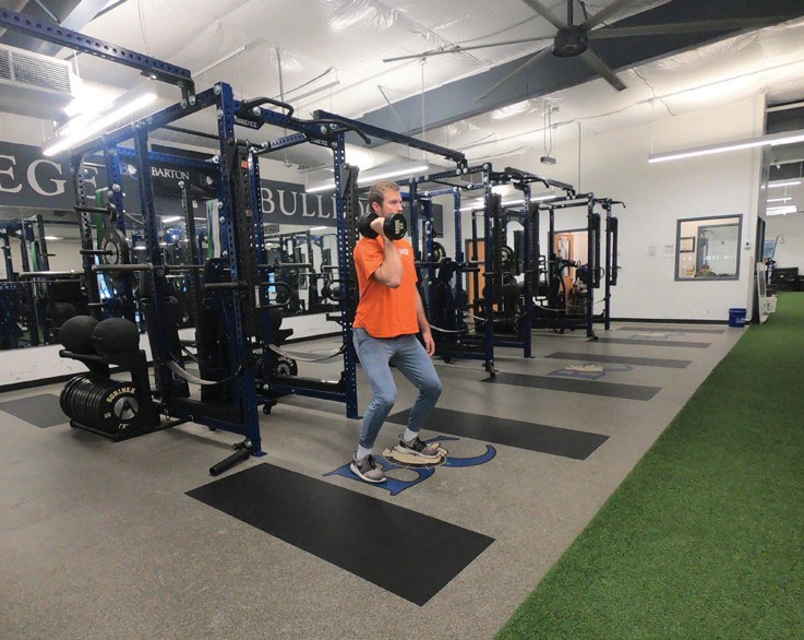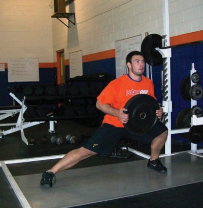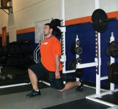- With the rear leg supported in the handle, position the front foot far enough forward that, when the back leg is lowered to the floor, the front knee does not extend out in front of the toes.