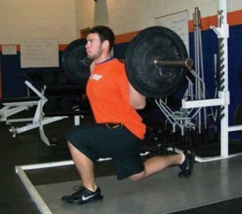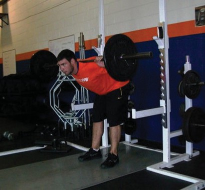 - When lowering the bar, keep the shoulders squeezed back (with over-exaggerated posture) and the knees straight but not locked, lowering the bar by sticking the butt out (NOT bending the knees or rounding the back)