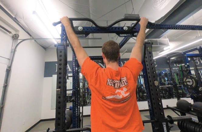 - Keeping your arms straight and abdominals tight, pull your arms down to the starting position.
