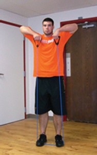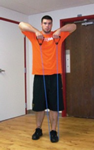 - Stand with your feet shoulder-width Facing away from the anchor point, grab the handles with your arms at your side.