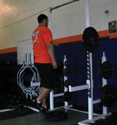 - Use a step or platform, feet shoulder width apart (can use a stable block of wood that allows your heel to be off the ground, if no step or platform)