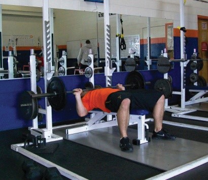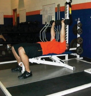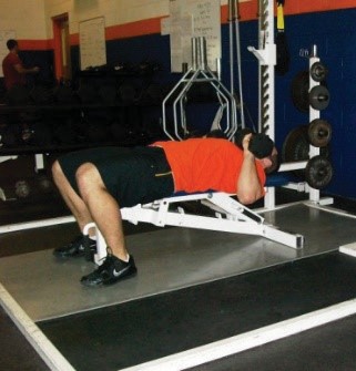 - Lie back on bench establishing five points of contact (head, shoulders/back and buttocks) on the bench and right and left feet flat on floor