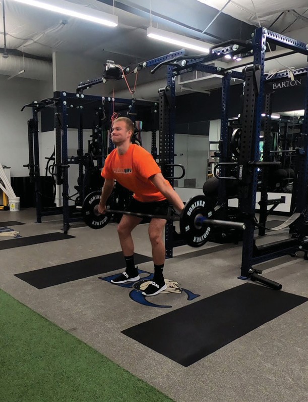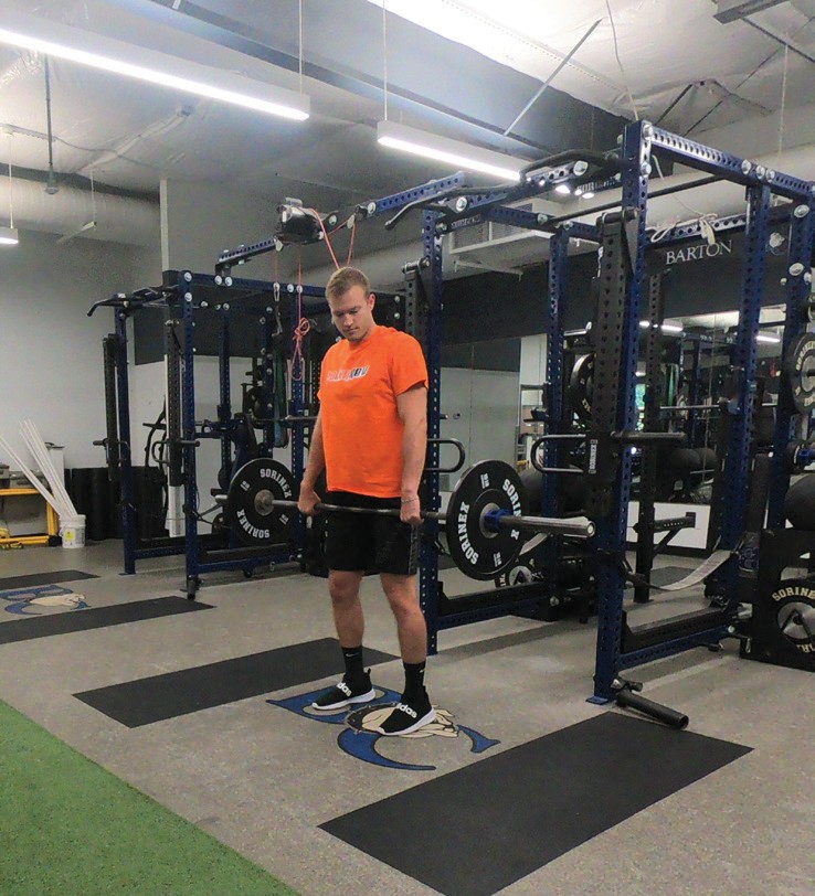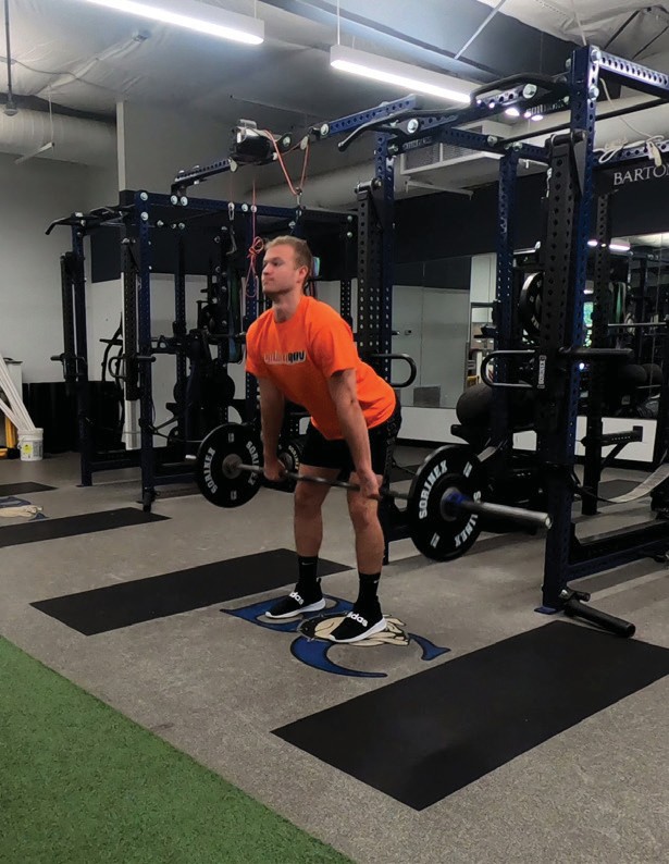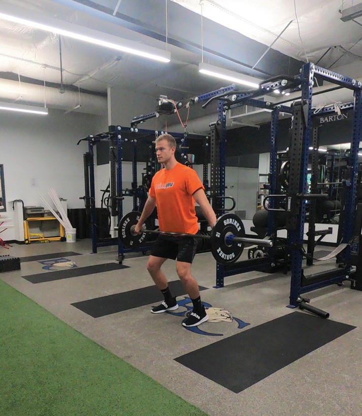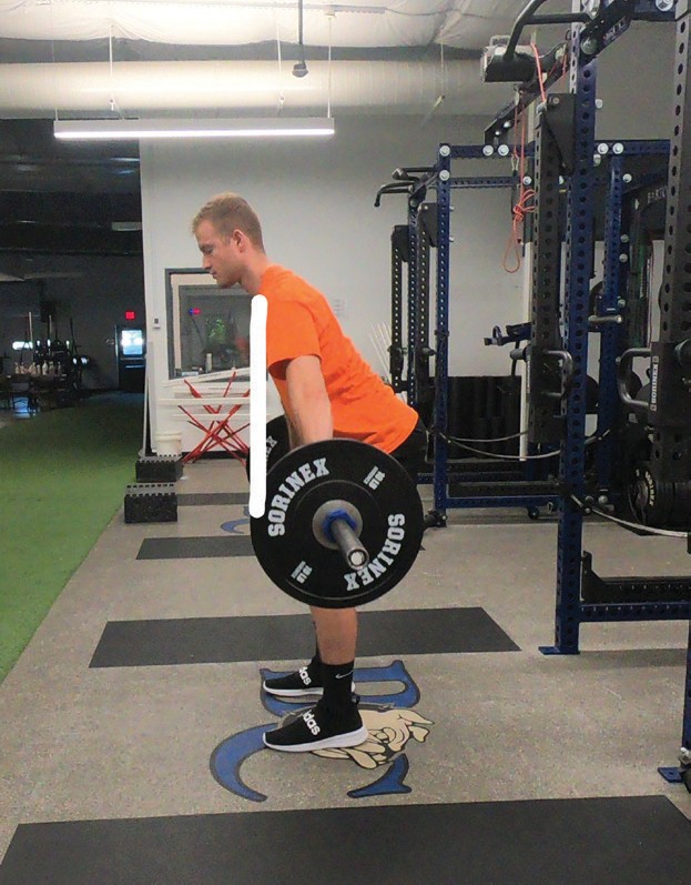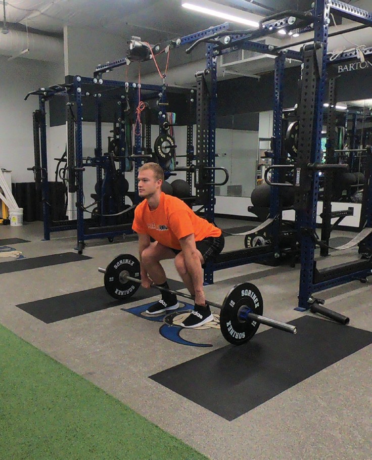 The get-set position is established by lowering the hips, pushing the knees forward (tibia more horizontal touching or almost touching the barbell) and raising the torso until the shoulders are stacked directly over or slightly in advance of the barbell. The shoulders should never be behind the barbell. Using the musculature of the legs and hips, drive the feet into the platform, allowing the knees to dis- place rearward (tibia will become more vertical). As the athlete is pulling, the hips and shoulders should rise together at the same rate, maintaining a constant back angle as established in the get-set position. As the bar rises, maintain close proximity of the barbell to the lower body by utilizing the latissimus dorsi musculature while keeping the elbows fully extended. Continue extending the hips and knees until the torso is fully erect.