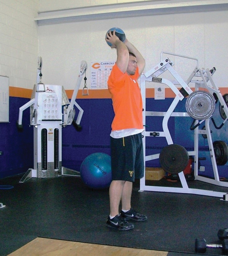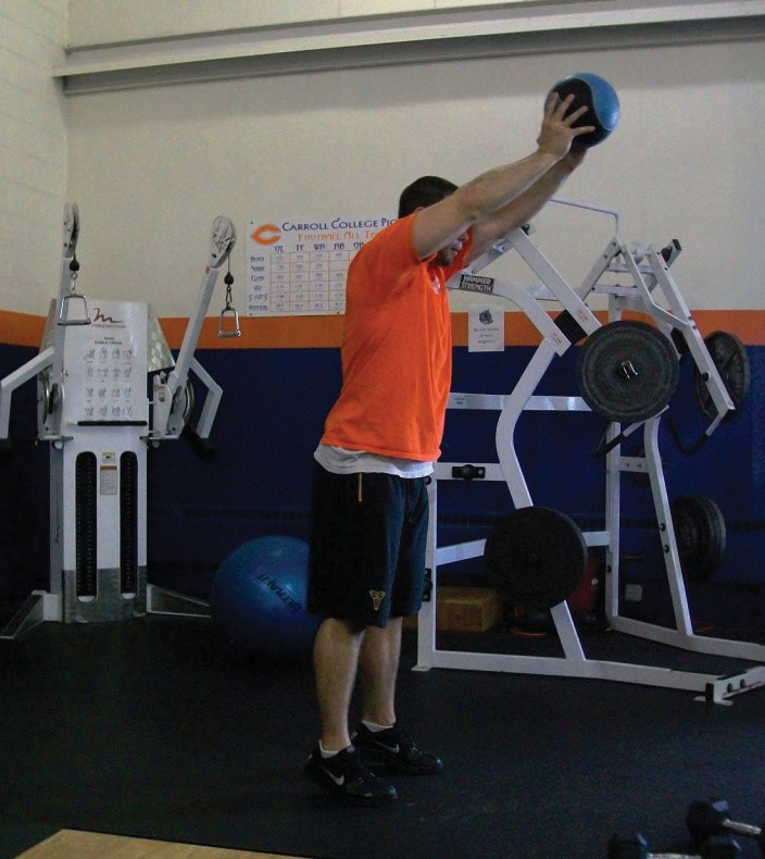- Using a medicine ball for resistance, raise the ball above head, fully extending the body to engage the back and core muscles