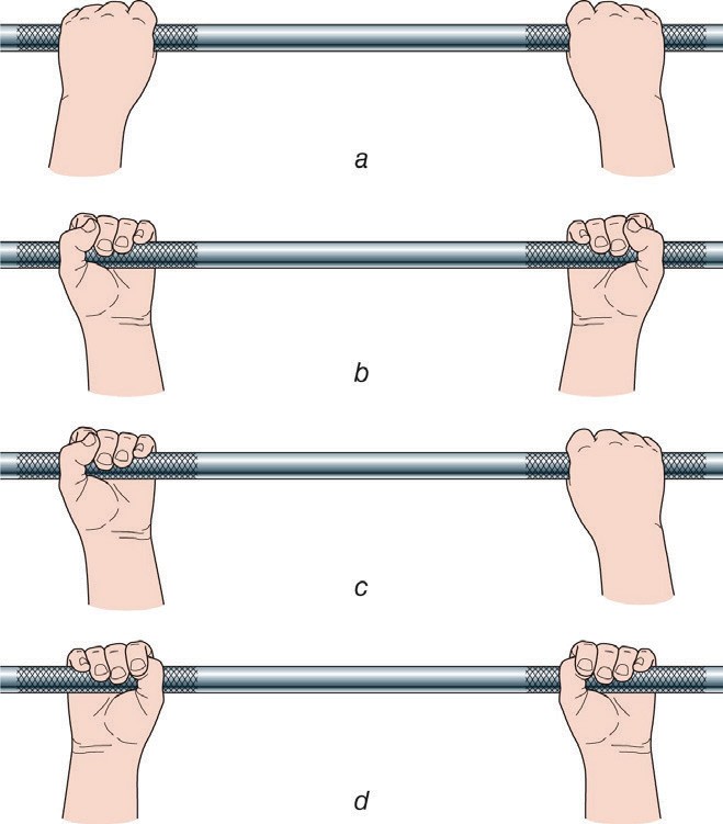 - Reach up and across body with both hands grabbing the handle with both hands at about a height slightly higher than head