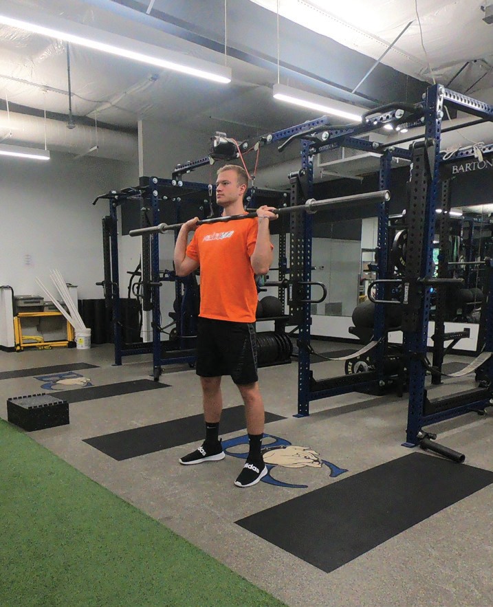 The barbell should sit high on the deltoids using a closed grip just outside shoulder-width. The elbows spread down and out (just ahead of the barbell). Stand with feet approximately hip width apart. The movement is executed by using only the musculature of the upper body (deltoids and triceps). Press the barbell from the shoulders into the overhead position, which will cause the barbell to travel both up and slightly back behind the ears. In the overhead position, the barbell should be directly above the shoulders, hips, knees and ankles. After pausing in the overhead position for 2-3 seconds, lower the bar- bell back to the shoulders.